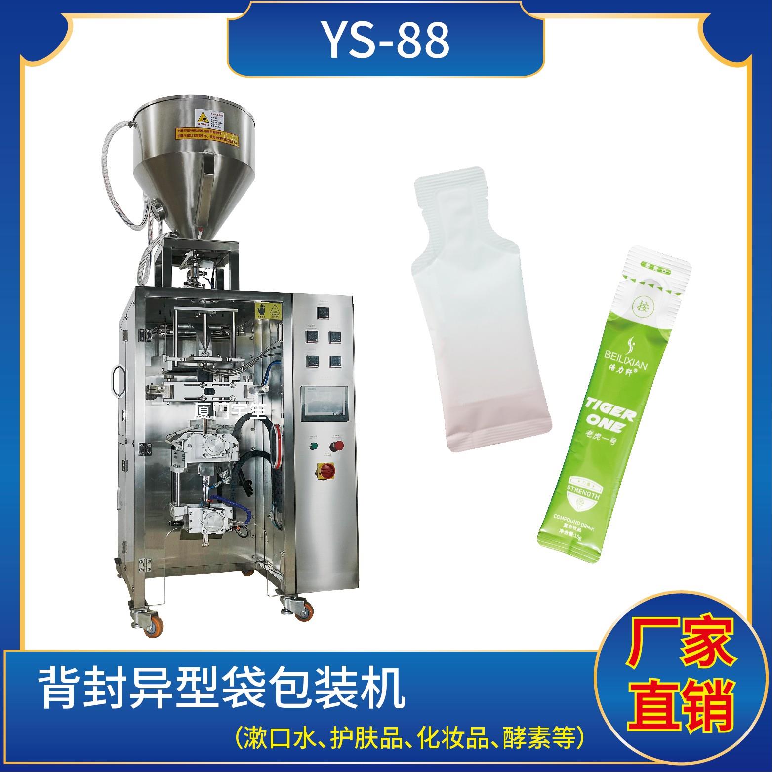 YS-88B 異形袋包裝機特 點 1、適用于食品、醫(yī)藥、化工、化妝品行業(yè)中液體、醬料等物品的異形袋計量包裝。2、可自動完成制袋、計量、下料、封合、分切、計數(shù)、且可根據(jù)客戶要求配置打印批號等功能。3、觸摸屏操作,PLC 控制,伺服電機控制袋長,性能穩(wěn)定、調(diào)整方便、檢測準確。智能式溫控儀,PID調(diào)節(jié),保證將溫度的誤差范…